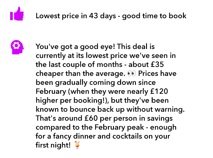 PriceWatcher is our intelligent value UI that transforms how travellers perceive your pricing. Seamlessly integrated into your website and advertising, it provides real-time price trend analysis and value validation with a human touch that builds immediate confidence.
